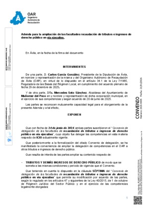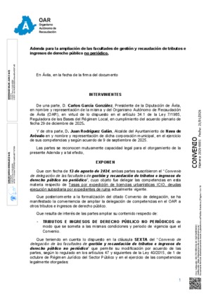 2026-0001.- Adenda - Convenio delegación facultades de gestión y recaudación de recursos no periódicos (ampliación resto de tributos e ingresos de derecho público) - Ayuntamiento de Nava de Arévalo