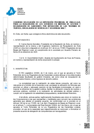 2026-0002.- Convenio delegación facultades de gestión y recaudación de sanciones por infracción de las Normas de Tráfico, circulación de vehículos y seguridad vial - Ayuntamiento de Hoyo de Pinares