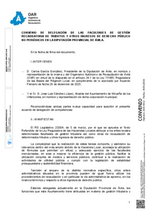 2026-0012.- Convenio delegación facultades de gestión recaudatoria de recursos no periódicos - Ayuntamiento de Mirueña de los Infanzones