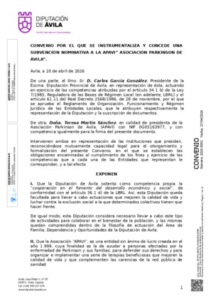 2026-0052.- CONVENIO POR EL QUE SE INSTRUMENTALIZA Y CONCEDE UNA SUBVENCIÓN NOMINATIVA A LA APAVI” ASOCIACIÓN PARKINSON DE ÁVILA”.