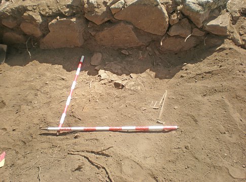 La eliminación del derrumbe permitió comprobar la existencia de otro nivel subyacente, compuesto por una tierra de tonalidad mucho más clara. En una zona central de la Estancia 1, que es la que se está excavando en la actualidad, se registró la existencia de lo que aparenta ser un hogar, un lugar en el que se efectuaron combustiones y que aparecía conformado por fragmentos de teja y barro. A unos centímetros de este hogar, se localizó un útil metálico con unas dimensiones aproximadas de unos 40 cm., que parecía estar articulado y rematado en uno de sus extremos por un tridente. Deberemos buscar paralelos en otros yacimientos para poder averiguar su utilidad aunque podría estar relacionado con el proceso de avivar el fuego.
