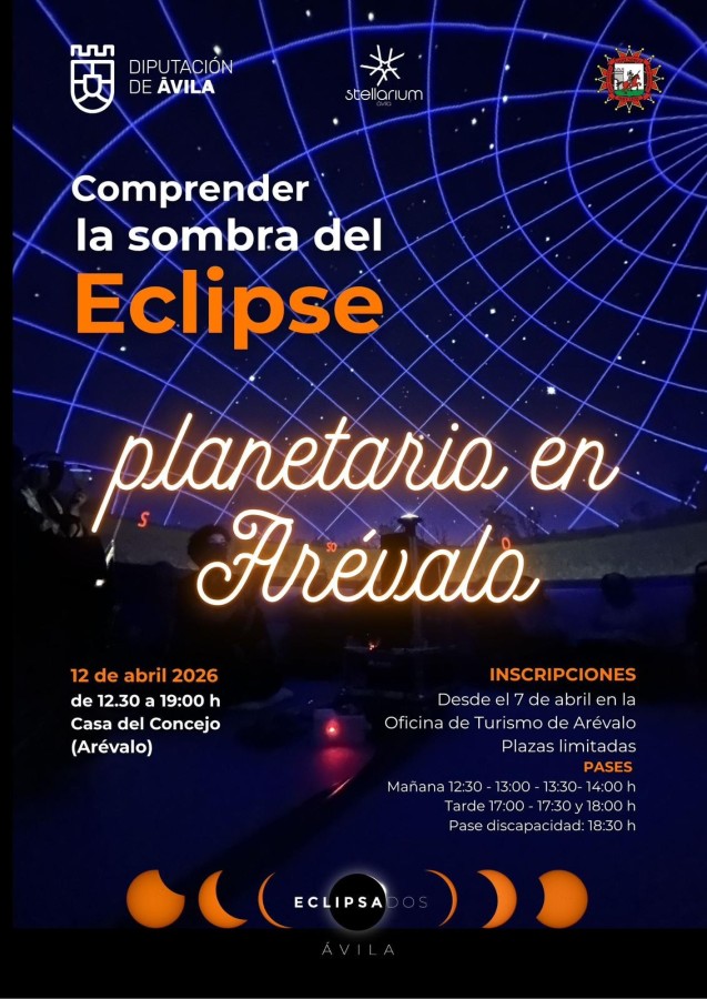 Otra de las acciones del hito de ayudar a conocer y comprender el eclipse del 12 de agosto es la instalación, en Arévalo, de un Planetario este domingo, cuando queden exactamente cuatro meses para el evento astronómico. En esa instalación, que estará situada en la Casa del Concejo, se proyectarán ocho pases de una proyección titulada ‘Comprender la sombra del eclipse’. “Las plazas tienen que ser, forzosamente, limitadas, y ya se han cubierto”, precisa el diputado provincial. Los pases serán a las 12:30, 13, 13:30 y 14 horas, por la mañana; y 17, 17:30 y 18 horas, por la tarde. A las 18:30 se realizará un pase exclusivo para personas con discapacidad.