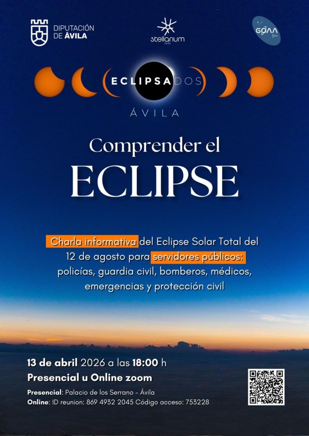 El lunes 13 de abril se celebrará la charla ‘Comprender el eclipse. Servidores públicos’, que será impartida por el presidente del Grupo de Observadores Astronómicos de Ávila (GOAA), José Raul Muñoz, y que irá dirigida a los empleados públicos que, por su condición laboral -especialmente en sectores como los Cuerpos y Fuerzas de Seguridad del Estado, médicos, emergencias y Protección Civil- tendrán un papel muy importante el día del eclipse.